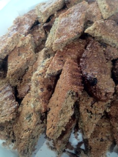 After all ingredients are mixed, place in large baking pan and pat down with moist hands. Bake for about 30 min. in a 350 degree oven. You can form into bars by scooping up golf ball size amounts of dough, and rolling them into logs. Place these on a parchment paper and bake for about 20 min. in a 335 degree oven. Let cool completely.