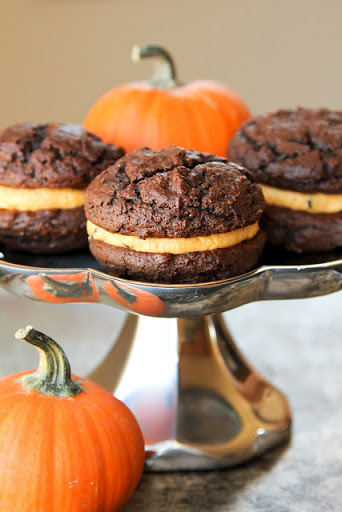 While the cookies are cooling, to prepare the filling, in the bowl of a stand mixer fitted with the whisk attachment, beat together cream cheese, butter and pumpkin.
