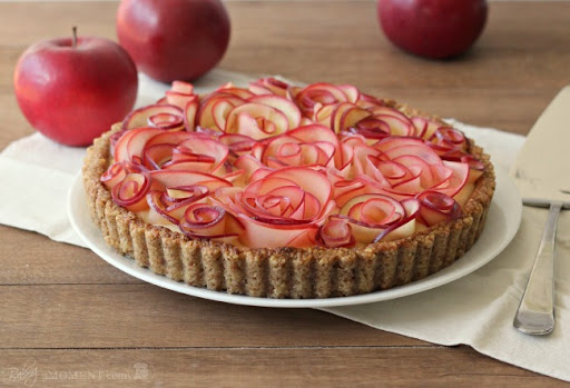 Roll a slice of apple into a tight spiral and stand it up vertically in the custard. Continue to arrange apple slices in a concentric pattern, around the first one, building a rose pattern.