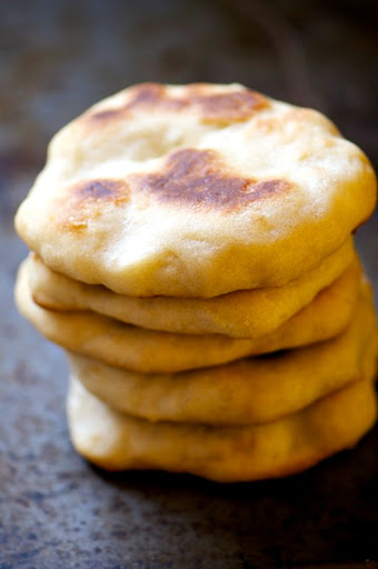 When you're ready to bake your Naan, turn your oven to 350F. I used a pizza pan and gave it a light coating of olive oil. Use the flour to help you flatten the dough balls into small, flat pieces, about 6" in diameter.