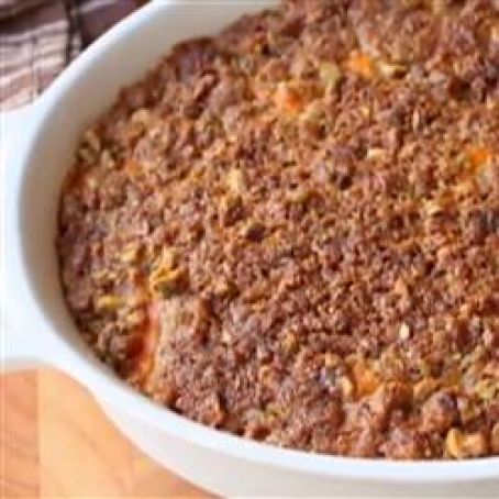 4. Mix pistachios, brown sugar, flour, and 1/4 cup melted butter together until completely mixed. Crumble topping evenly over top of sweet potatoes. Use the back of a fork to gently press pistachio mixture down onto sweet potatoes.