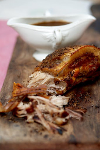 Put the seasoned pork belly on top of the vegetables and then put into your very hot oven for 10-15 minutes or until the skin of the belly starts to bubble and is golden brown. Turn the oven temperature down to 170°C/325°F/gas 3 then roast for 1.5 hours. Carefully open the oven door and add into the tray ¾ of the white wine, continue cooking for 1 hour. Remove the meat carefully from the oven and test to see if it pulls apart easily. If not put back in the oven until the meat is ready then remove from the oven. Take the meat from the tray and place onto a wooden board and allow to rest while you make the gravy. Put the tray of roasted vegetables directly onto your stove top and on a medium heat add in the flour and stir till thick. Cook for 1 minute then add in the remaining wine. If you sauce is too thick add a little more white wine. Using a potato masher, mash up the vegetables until you have a delicious thick looking sauce. Cook for 2-3 minutes on a low heat. Taste, strain through a sieve keeping all the lovely sauce for pouring over the roasted belly.