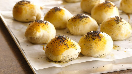 Separate dough into 5 biscuits. Cut each biscuit into fourths. Flatten each dough piece enough to hold filling. Spoon about 3/4 teaspoon cream cheese mixture onto center of each; top with 1 olive. Wrap dough around olive; pinch seams tightly to seal. Place on cookie sheet. Brush each with egg; sprinkle with poppy seed.