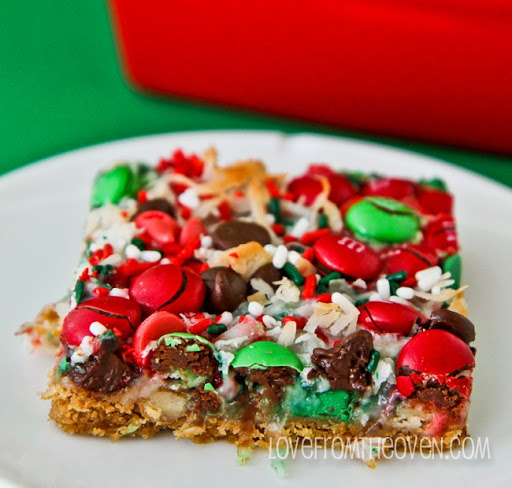 The magic of these Christmas cookie bars is that they are so easy to make! No mixing needed - the ingredients are simply layered in the pan for baking.