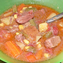 Remove from oven and add the tomatoes, carrots, potatoes, peas, water, onion soup mix, salt and ground black pepper. Stir with a wooden spoon, cover and return to the oven.