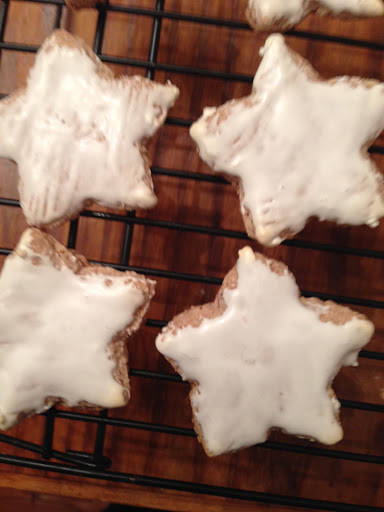 4.Roll the dough to 1/4 inch thickness on a surface that has been sprinkled with confectioners' sugar. Using a 2 1/2-inch star cookie cutter, cut out the cookies and place them on the cookie sheets.