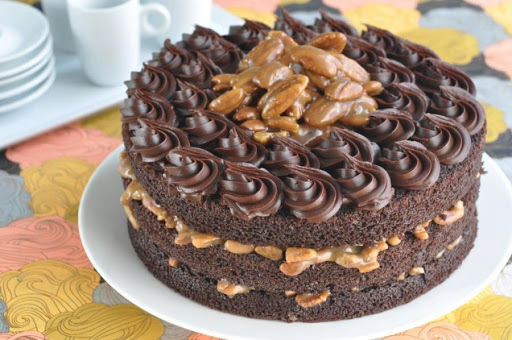 For the top of the cake: Fill a pastry bag fitted with a medium pastry star tip with cooled ganache. If ganache is still too soft-runny to pipe it is best to wait, although the ganache can be chilled if set in ice water and stirred. Pipe a double ring of rosettes on surface of the cake. Fill the center of cake with a mound of pecan halves caramel filling.
