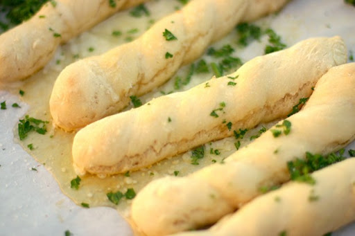 As soon as you remove your breadsticks from the oven, mix together the melted butter, garlic powder, sea salt, and grated parmesan. Drizzle oven hot breadsticks. Sprinkle with fresh chopped parsley and serve immediately.