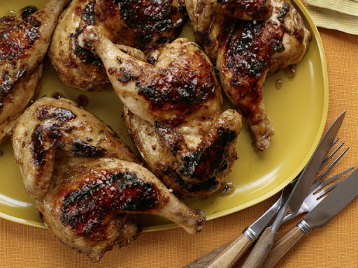 Remove the hens from the marinade, letting any excess drip off; place skin-side up on the cooler side of the grill (position the legs closer to the fire). Cover and cook until the hens are golden brown, about 15 minutes.