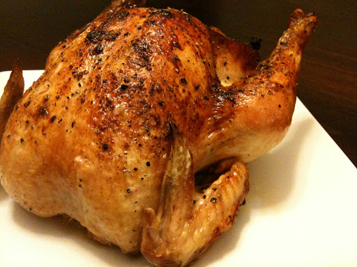 Pat the chicken dry with paper towels. Place the chicken breast-side down in a medium roasting pan fitted with a rack and pour the lemon juice all over the chicken, both inside and out. Season the chicken all over with salt and pepper, inside and out.