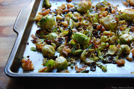 Heat the broiler. Trim about a pound of Brussels sprouts and pulse in a food processor—or use a knife—to chop them up a bit. Spread out on a rimmed baking sheet, drizzle with two tablespoons olive oil, sprinkle with salt and pepper, and toss. Broil the sprouts for about five minutes, until browning on the edges. Meanwhile pulse a handful of hazelnuts (or chop them). Shake the pan to flip the sprouts, add the nuts and broil for another three minutes. Sprinkle with freshly squeezed lemon juice and plenty of fresh parsley.