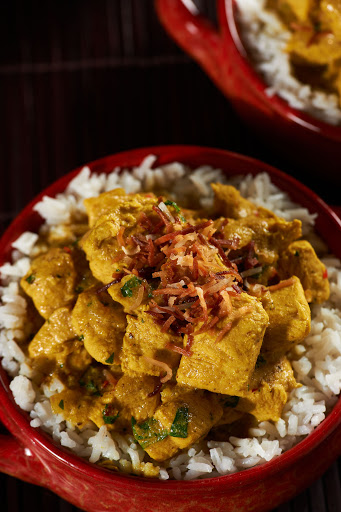 Serve over white rice, if desired, and garnish with the toasted coconut.