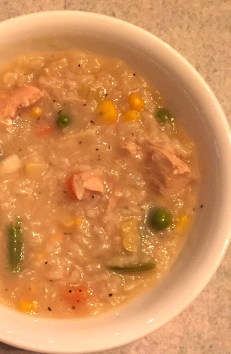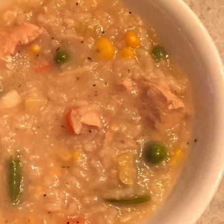 Add chicken and vegetables to large pot of broth. Stir in rice, salt and pepper and simmer 15 minutes. (Until rice is tender.) Mix milk and cornstarch together then add to soup. Stir until thickened. Serves 16-20.