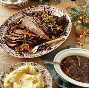 7. Remove brisket to a cutting board, and slice across the grain. Transfer slices to a serving platter, and cover loosely to keep warm. Pour cooking liquid through a fine wire-mesh strainer into a medium saucepan; discard solids. Bring liquid to a boil over medium-high heat. Stir in onion-mushroom mixture, and cook, stirring occasionally, 5 minutes.