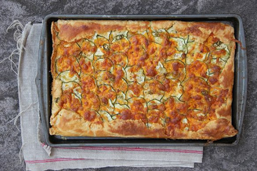 Bake the zucchini-cheddar pie until the pastry is golden and the zucchini is tender, about 25 minutes. Let the pie cool to warm, and then serve.