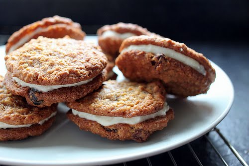 Have you ever had an idea you were really happy with only to find out it wasn’t unique or original like you thought it was. I was travelling to work and as normal my mind wasn’t on the day ahead instead it was where it normally is, back in the kitchen thinking up ideas. In fact most of the ideas I have come at odd moments, often just before I go to bed or at the gym, but more often than not they come whilst I’m bored at work. Unfortunately I wont have that time to dream up recipes I want to play with or techniques I want to try because as of last Friday I joined the ranks of the unemployed. I handed in my notice and left. Do I have something new and exciting lined up I hear you ask? No. So yes, maybe not the smartest thing taking a risk like this in this climate but I have decided it was time for some changes and to just make the leap. I’m taking a little time to do some thinking and planning about the future and am really excited to see what’s next (and on that note if anyone knows a pastry chef or baker that might be looking to take on a trainee drop me a line). Anyway like I said this idea wasn’t original it turns out there are loads of recipes out there for carrot cake cookies. I haven’t finished coming up with my own recipe so until then this is Martha’s and you know what? They are seriously good, although I used my own filling recipe.