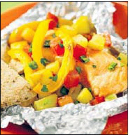 3. Fold edges of foil up to enclose fish tightly. Bake in preheated oven for 15 minutes or until fish flakes easily with a fork. Kitchen tip: Serve this dish with whole-grain pita bread to scoop up vegetables. Makes 2 kid-sized servings. Nutritional analysis ( per serving): Energy: 224 kcal Protein: 17 g Carbohydrate: 28 g Fat: 6 g Fibre: 4 g Calcium: 56 mg Iron: 2 mg Sodium: 186 mg