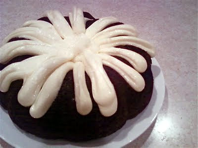 Mix first six ingredients together with a beater. Add chocolate chips. Pour into a greased bunt cake pan (cooking spray works best). Cook in oven at 350 degrees for 45-50 mins. Remove from oven. Let cool for 20 mins. Remove from pan. (I think it tastes best if you put it on a serving plate, wrap it well in Saran Wrap, and let it sit overnight in the fridge before frosting and serving..) In a medium bowl, cream together the cream cheese and butter until creamy. Mix in the vanilla, then gradually stir in the powdered sugar (start with 2 cups then keep adding more until it is nice and thick).