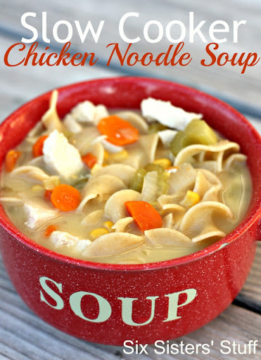 Add everything but the noodles and cooked chicken to the crock pot. Cook on low heat for 6 hours. Add the uncooked noodles and cooked chicken, turn heat to high, and cook for one more hour. Serve and enjoy!