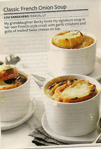 To serve, place twelve 8-oz. broiler-safe bowls or ramekins on baking sheets. Place two toasts in each. Ladle with soup; top with cheese. Broil 4-in. from heat until cheese is melted. Yield: 12 servings.