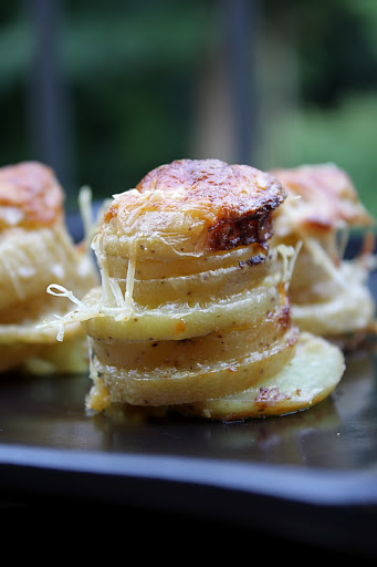Slice the potatoes very thinly with the skin on. A mandoline is best. Spray muffin tins with cooking spray or brush them with unsalted Horizon Dairy Butter.