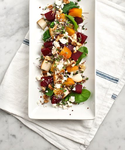 Assemble all salad ingredients on a platter. Drizzle with a liberal amount of walnut oil, a bit of balsamic vinegar, a little honey, and some salt and pepper. (or for a cleaner look, toss the balsamic only with the red beets, before assembling the salad).