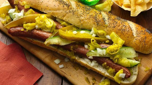 Place hot dogs on French loaf halves. Top with relish, peppers, cucumbers, pickles and onion. Sprinkle with celery salt. Cut each in half to total 4 open-face servings.