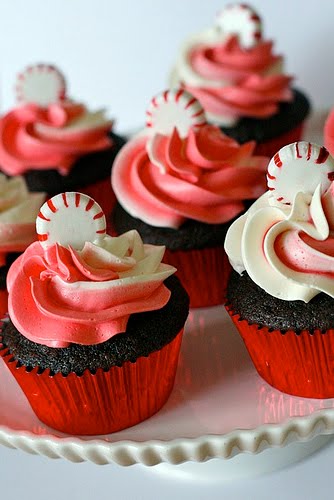 If you would like the red and white swirled frosting effect, remove about half of the frosting to a bowl. With the remaining frosting in the mixing bowl, add red gel coloring and mix until you have achieved the desired shade. Fit a pastry bag with a large tip. Fill one side of the pastry bag with the white frosting, and then fill in the other side with the red frosting (this does not need to be exact – just enough so that both colors are included.) Pipe a test streak until you see both colors coming out of the tip. Frost cupcakes as desired, refilling the pastry bag in the same manner as needed.