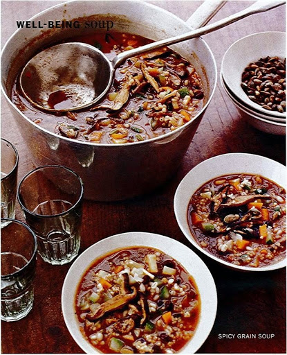 tilla soup, this fiery, substantial soup is full of nutty-tasting barley, brown rice and bulgur, creating a dish that's high in fiber.