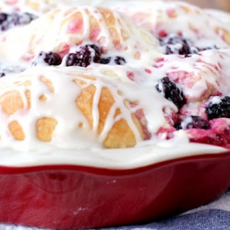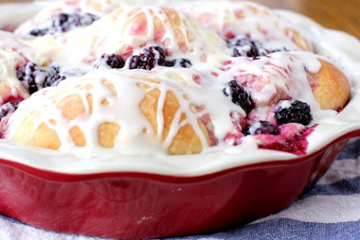 Allow the dough to rise 15-20 minutes, then spread dollops of the cream cheese filling all over the creases of your rising balls of dough. Top with blackberries spread randomly across the top of your rolls. Allow to rise 20 minutes more, then bake in your preheated oven for 18-20 minutes, or just until the rolls are golden brown and cooked through. Don't overcook your rolls! Pull them out of the oven before they become overly brown.