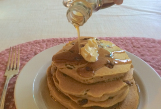 This recipe is by Karen Raye, posted to the blog Kitchen Treaty. It's shown in the original form, but when I made it, I cut the recipe in half, and it made 8 pancakes. Not just any pancakes, but the best ones ever! I added chopped pecans, just sprinkling them on top of the pancakes as the first side cooked; chopped bacon would also be nice. We used an electric grill set to 350º, 3 minutes per side. The batter is much thicker than any pancake batter I've seen, and so is the finished product. My husband said they were the best pancakes he's ever had. Photo is my own.