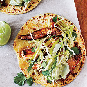 Create authentic Mexican-style tacos by cooking the chicken in a mixture of ancho chili powder and cumin and serving over corn tortillas topped with slaw and avocado cream.