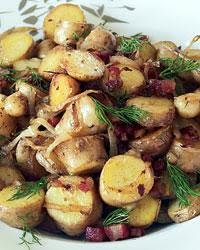 3. Add the potatoes to the skillet, season with salt and pepper and cook, stirring occasionally, until lightly browned, about 10 minutes. Add the onion and cook until softened and the potatoes are golden brown, about 10 minutes longer. Stir in the pancetta and cook for 2 minutes longer. Transfer the potatoes to a bowl. Toss with the dill right before serving.