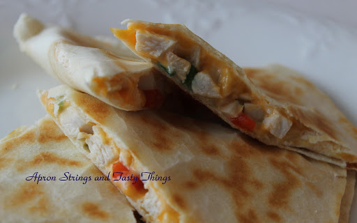 For each quesadilla, place about 1/4 cup shredded cheese on one half of the tortilla. Top with about 1/4 cup chicken, a couple tablespoons of peppers and a sprinkle of scallions. Add a little more cheese if you like. Fold the tortilla over and place into a medium-hot pan that has been sprayed with cooking spray. Cook until the first side is golden brown, then flip and cook until the other side is browned and the cheese is melted throughout. Remove from pan, slice into quarters and serve with salsa and sour cream on the side. Enjoy!