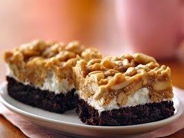 2. In 3-quart saucepan, heat corn syrup, butter, vanilla and peanut butter chips over medium heat 3 to 4 minutes, stirring constantly, until chips are melted. Remove from heat; stir in cereal and peanuts. Spread evenly over marshmallows. Refrigerate 45 minutes or until firm. For brownies, cut into 5 rows by 5 rows. Store in refrigerator.