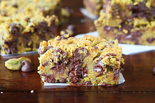 1. Place 2 cups shelled pistachios into the work bowl of a food processor. Process for 10 minutes until smooth and creamy. Preheat oven to 350 degrees F. Line an 8×8 baking dish with foil, then coat generously with non-stick cooking spray.