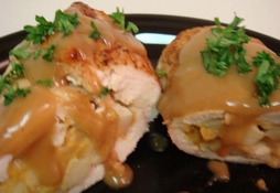 Place chicken in a large pot of boiling water. Cook for 8 to 10 minutes; set aside. Combine crumbs with 1/2 cup butter; mix thoroughly. Add remaining butter to a saucepan; stir in flour and cook about one minute, stirring often. Add milk, soup and cheese; stir to blend until cheese is melted. Place chicken in a greased 13"x9" baking pan. Cover chicken with cheese sauce, top with sliced apples and sprinkle with cracker mixture. Bake, covered, at 350 degrees for 35 to 40 minutes. Makes 6 servings.