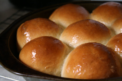 Remove pans from oven and generously brush the rolls with melted butter (you might have a little left after brushing). Let sit for 2-3 minutes, and then carefully remove them from the pan and allow to cool on a wire rack.