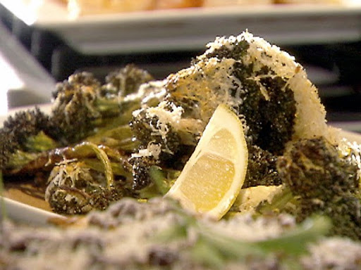 Remove the broccoli from the oven and sprinkle the cheese evenly over the top and bake until the cheese melt and forms a crisp shell over the broccoli, about 10 minutes. Lift the broccoli out onto a platter with a spatula and drizzle with fresh lemon.