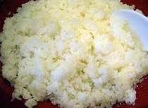 Using a rice paddle, scoop cooked rice into a large shallow baking pan. Pour half the vinegar mixture evenly over the surface. Fold liquid in, carefully. Continue fanning and folding until little liquid is left. The rice absorbs the excess liquid as it cools.
