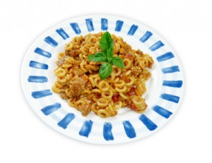 4.Add noodles, pepperoni, pizza sauce and milk, and mix well. Pour mixture into 2-quart casserole dish.