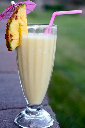 Combine all ingredients in a blender or food processor and puree on high speed until smooth and well combined. Pour into tall glasses and garnish as desired with fresh pineapple.