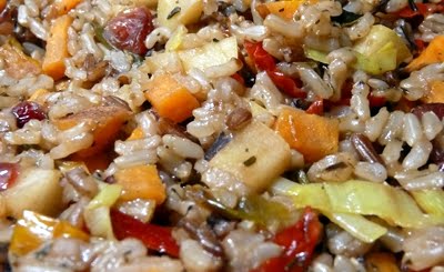 When the rice is cooked, fold in the apples and sweet potatoes, then add them to the sauce pan with the leeks and peppers. Toss until all the fruits/veggies are evenly distributed.