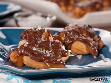 In another small saucepan over low heat, melt chocolate chips with shortening 5 to 7 minutes, or until smooth, stirring constantly. Drizzle chocolate over caramel-covered nuts, evenly sprinkle with sea salt, and let stand until firm.