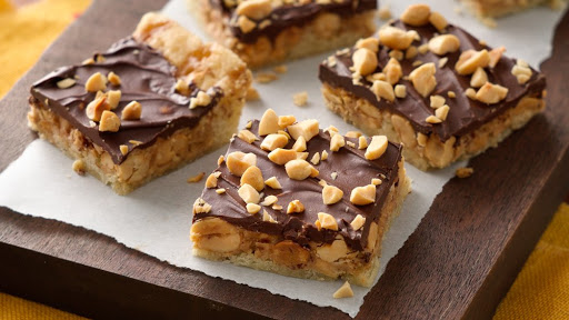 Bake 20 to 25 minutes or until edges are golden brown. Sprinkle chocolate chips over bars; return to oven. Bake 1 minute or until chips soften; spread over bars. Sprinkle with reserved peanuts; press in lightly. Cool 30 minutes in pan on cooling rack. Refrigerate about 25 minutes or until chocolate is set. Cut into 8 rows by 6 rows. Store covered.