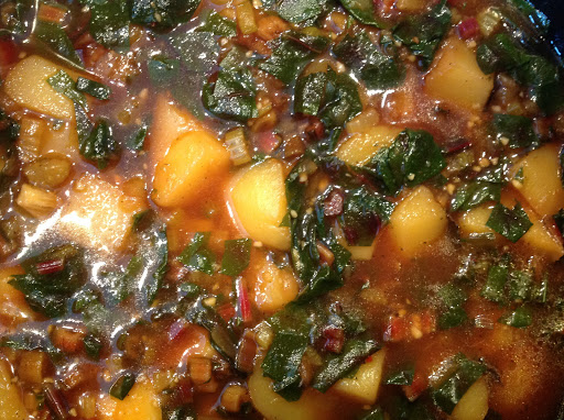 Separate chard stems from leaves. Slice stems thin. In a large kettle, sauté the sliced stems, celery, and onions in hot oil and butter for five minutes. Add the potatoes and broth and bring to a boil. Reduce heat and simmer 15-20 minutes. Stir in chard leaves and cook for 4-5 minutes. Season to taste.
