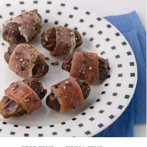 Wrap a slice of prosciutto around each date. Grind pepper on top.