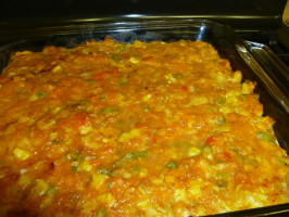 This delicious casserole has become a tradition at my family's Thanksgiving. And everyone agrees we should make it more often, it's so good, and not hard to make. I've changed this recipe only slightly from the Chilean Squash in the Moosewood Cookbook. You can substitute mashed pumpkin or yams (unsweetened, of course!), but the butternut is best and worth the effort. A tip for easier clean up: I just mash the squash right in the casserole and mix everything there. I wipe off the upper sides wih a clean, damp dish towel and pop it in the oven. I've been tempted to add a cup or two of cooked rice or other grain to make it even more hardy, but I haven't tried that yet... Note: cook time does not include time for baking the squash; that can be done ahead and refrigerated.