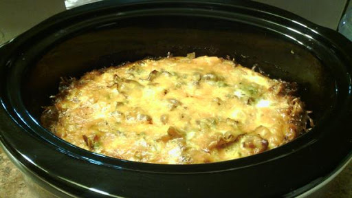 A delicious and simple breakfast recipe using a crock pot. Prepare it at night and it's ready in the morning. Also delicious used as the filling for breakfast burritos. Food.com #410913