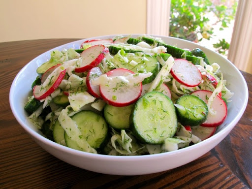 Place the cucumbers and radishes in a salad bowl along with the shredded white cabbage.